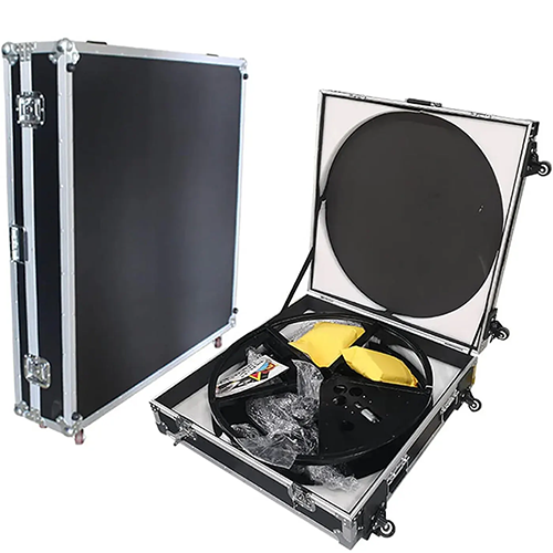 - Professional flight case made of durable polywood, with sponge lining, 4 multidirectional silicone wheels (with locking system), and 5 metal handles for easy transport.
