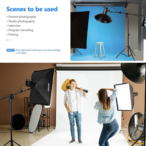 This boom stand functions both as a traditional light stand and an extended boom arm, giving you maximum creative control. With a 2m vertical stand height and a 1.9m boom arm reach, it allows you to position lights or microphones exactly where needed—without cluttering your frame.