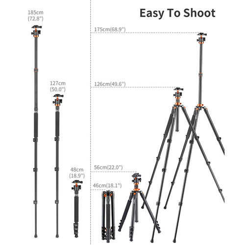 The SA254M2 DSLR Camera Aluminum Tripod from K&F Concept is a lightweight travel tripod that is rich in the kind of features found in much larger tripods. The legs may be positioned independently to multiple angles for use on uneven terrain, and they open or close quickly with large flip locks. The legs may be inverted for ultra-low level shooting and reverse fully and fold to a travel-ready 18.1″ length. For shoots where an even more compact support is called for a removable leg converts into a monopod, and the center column may be combined with it to form an full-sized tall monopod. The included tripod ball head incorporates an Arca-type quick release clamp and quick release plate set and features quick single knob release and an independent pan locking knob for panoramic imaging.