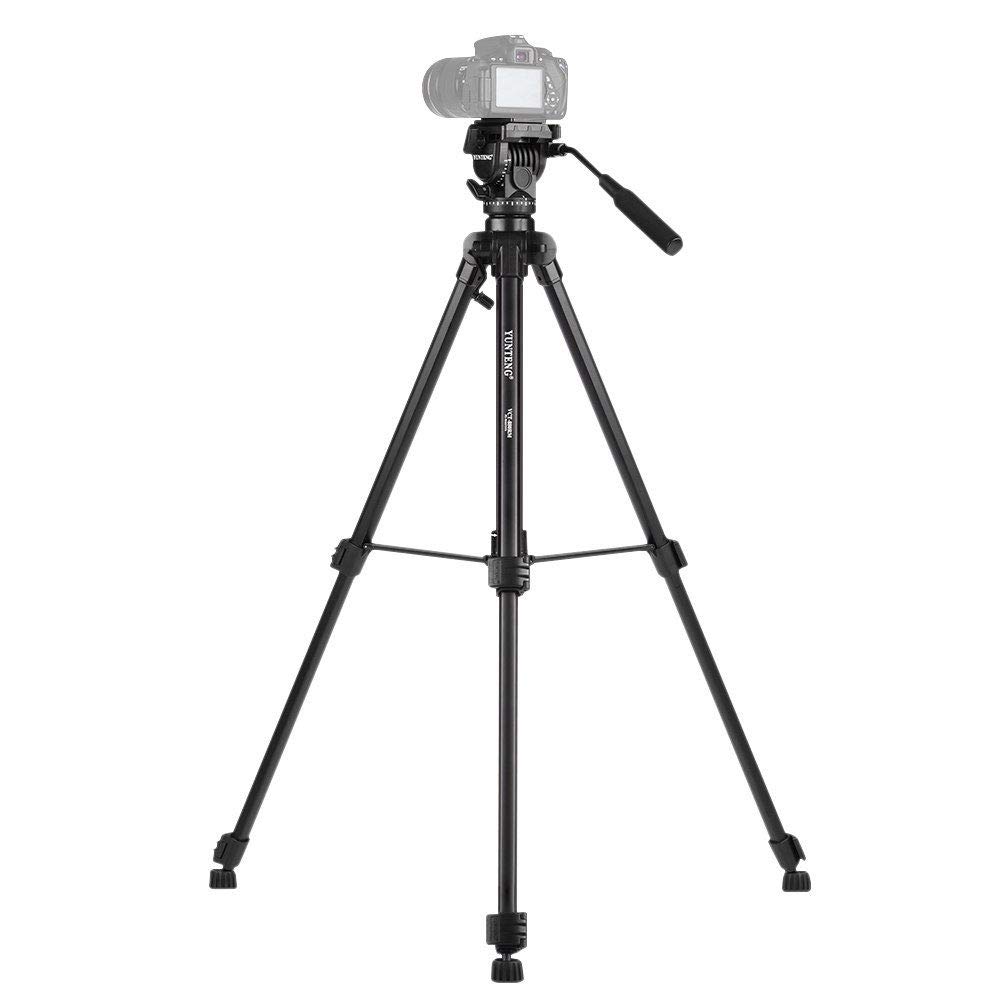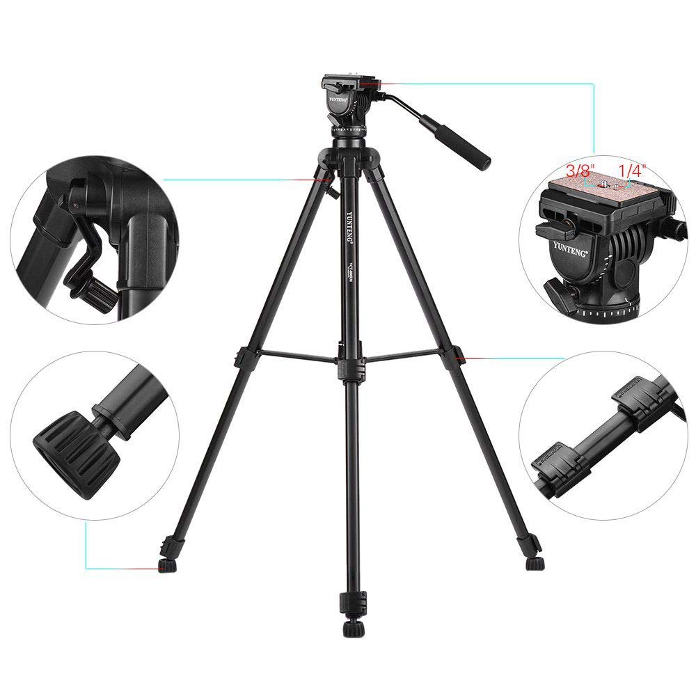 The Yunteng VCT-880RM tripod is a solid, portable, and affordable professional camera tripod with a three-dimensional damping head. To assure level pictures, a built-in bubble level is provided. Camera tripod quick changes from landscape to portrait are provided by the 90-degree vertical swivel ball head. The Yunteng tripod also provides 360-degree horizontal adjustment. A grip facilitates adjusting the viewing angle and head shot. Height can be adjusted using the gear-operated center column. The Yunteng VCT-880RM tripod stability is assured by the non-slip rubber feet. A rapid camera tripod setup is provided by the quick-release leg locks. When rapid change from tripod to hand-held photography is required, a detachable quick-release plate is provided. This also allows for rapid camera attachment to the tripod. The Yunteng tripod uses a 1/4-inch male thread and is compatible with all cameras and camcorders. Its maximum load is 11 lbs (5Kg). Its folded height is 26 inches (660 mm), with its full height at 65 inches (1651 mm). A carrying bag is included. The Yunteng VCT-880RM tripod is ideal for outdoor, travel, or timer shot